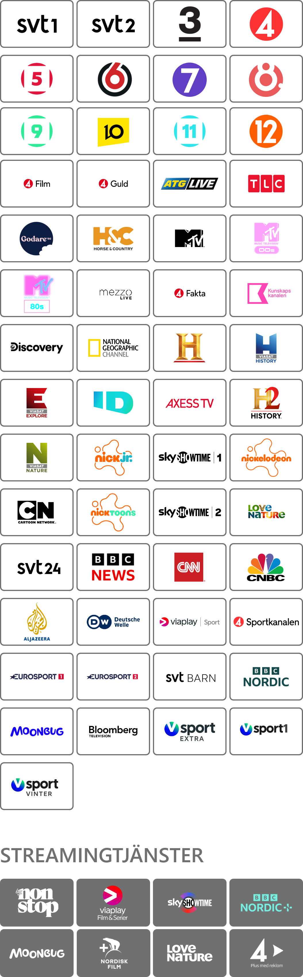 Familjefavoriten med en perfekt mix av underhållning, sport och streaming! Här får du ett brett kanalutbud med mycket att välja på – sport, fakta, nyheter, underhållning och massor av tv för barn. Även flera streamingtjänster, inklusive Viaplay, ingår via Allentes app.